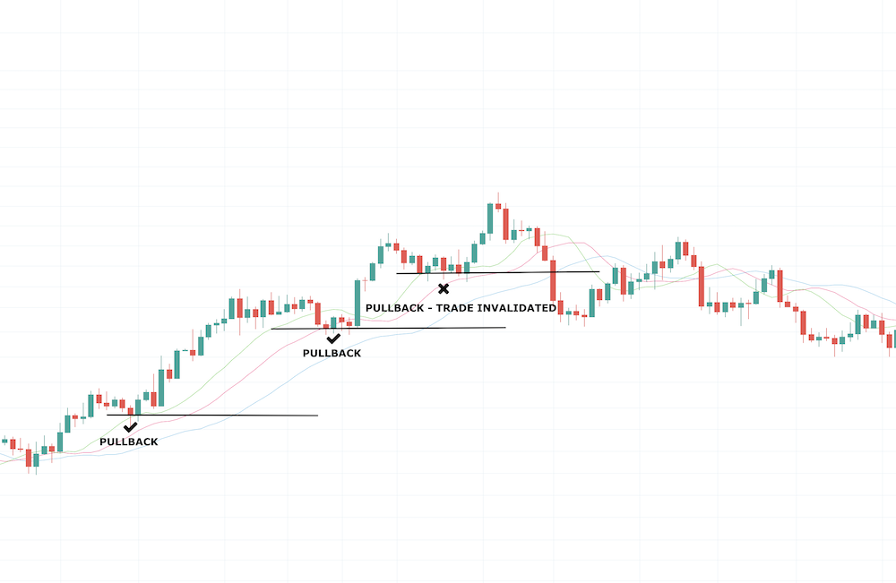 When markets begin to trend, traders can look for pullbacks the Williams Alligator lines to take a position, setting a stop below the support level as a point of invalidation. In the following example, the red line or alligator teeth acts as support at two pullbacks. The third pullback trade was invalidated after the price failed to find support at the lips, teeth, or jaw once again, and broke below previous pullback support.